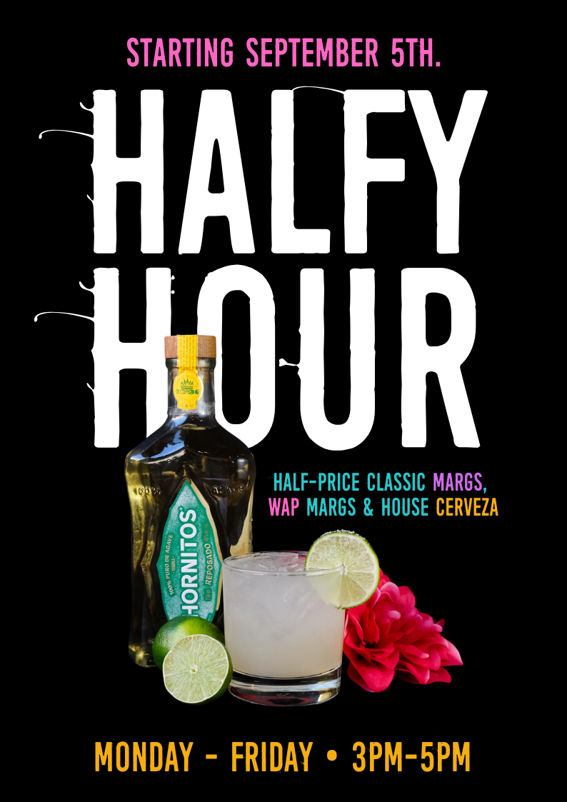 STARTING TODAY, SEPTEMBER 5TH, YOU CAN ENJOY HALF-PRICE CLASSIC MARGARITAS, W.A.P. MARGARITAS AND HOUSE CERVEZA!